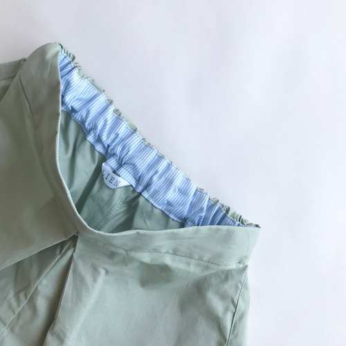 ウエスト部分はキレイめにもはける様、前はゴムを入れず、後ろのみゴム仕様にしました。ウエストベルト裏はサックスブルーのストライプを使用しております。